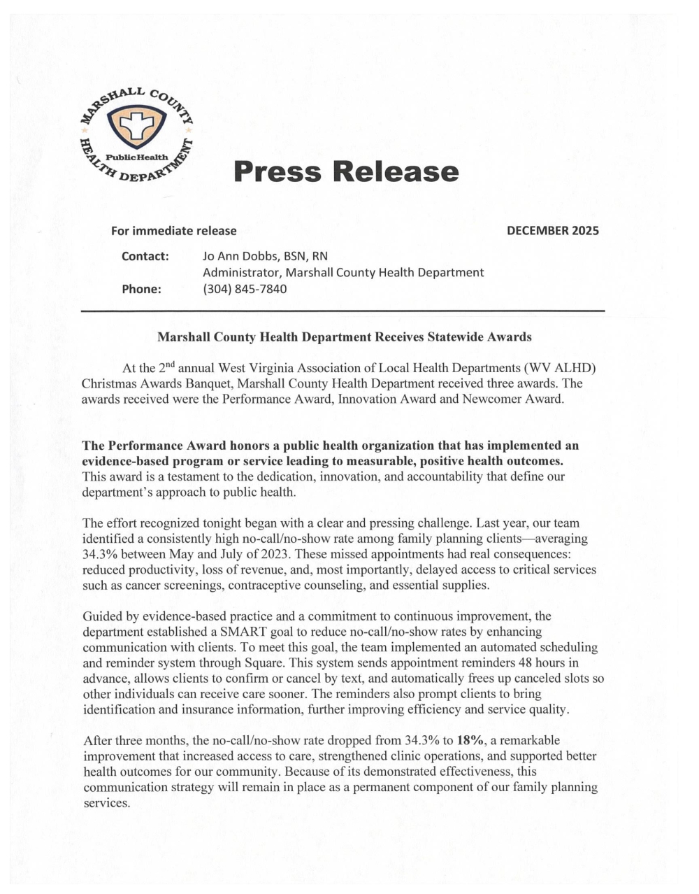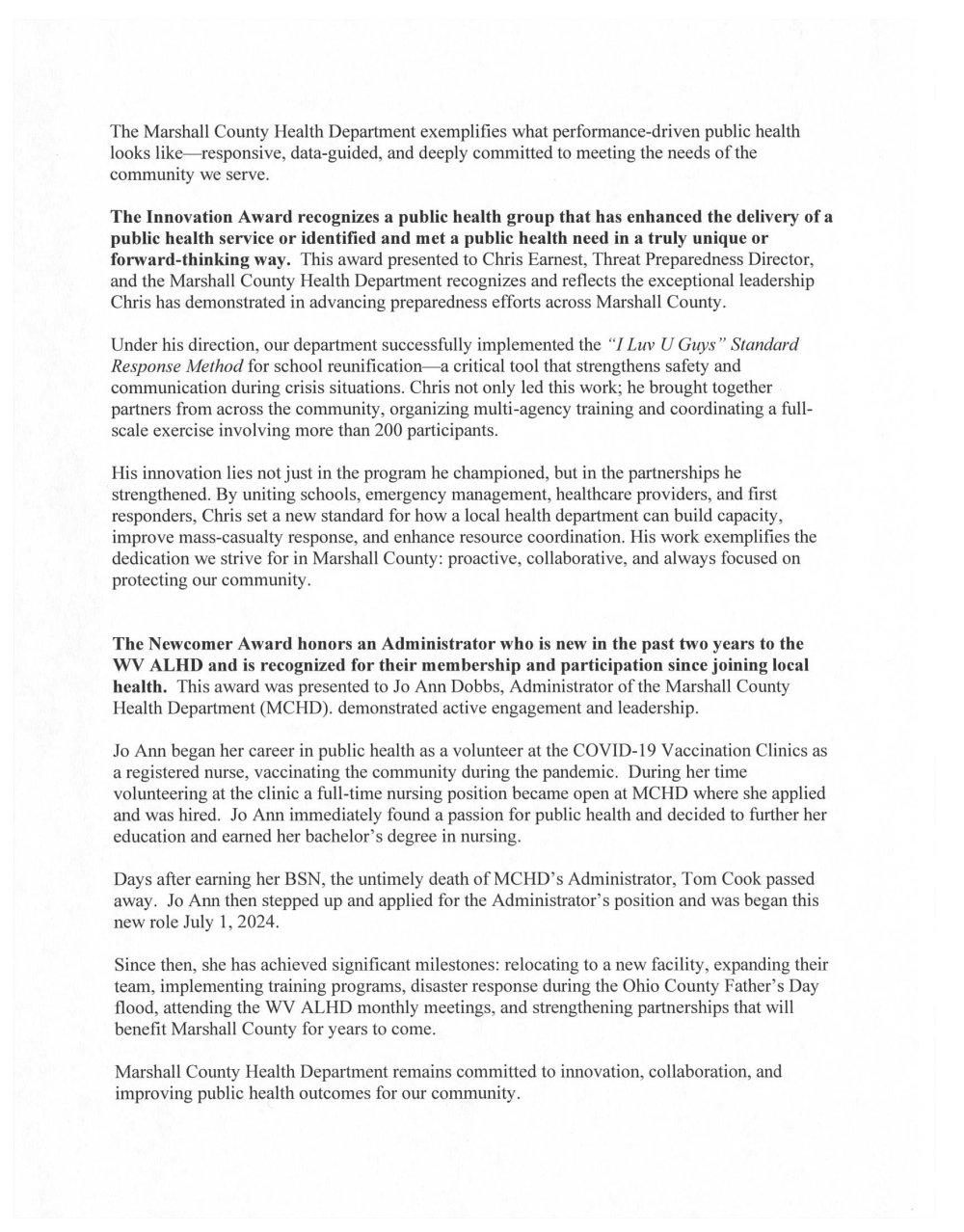 MARSHALL COUNTY HEALTH DEPARTMENT RECEIVES STATEWIDE AWARDS